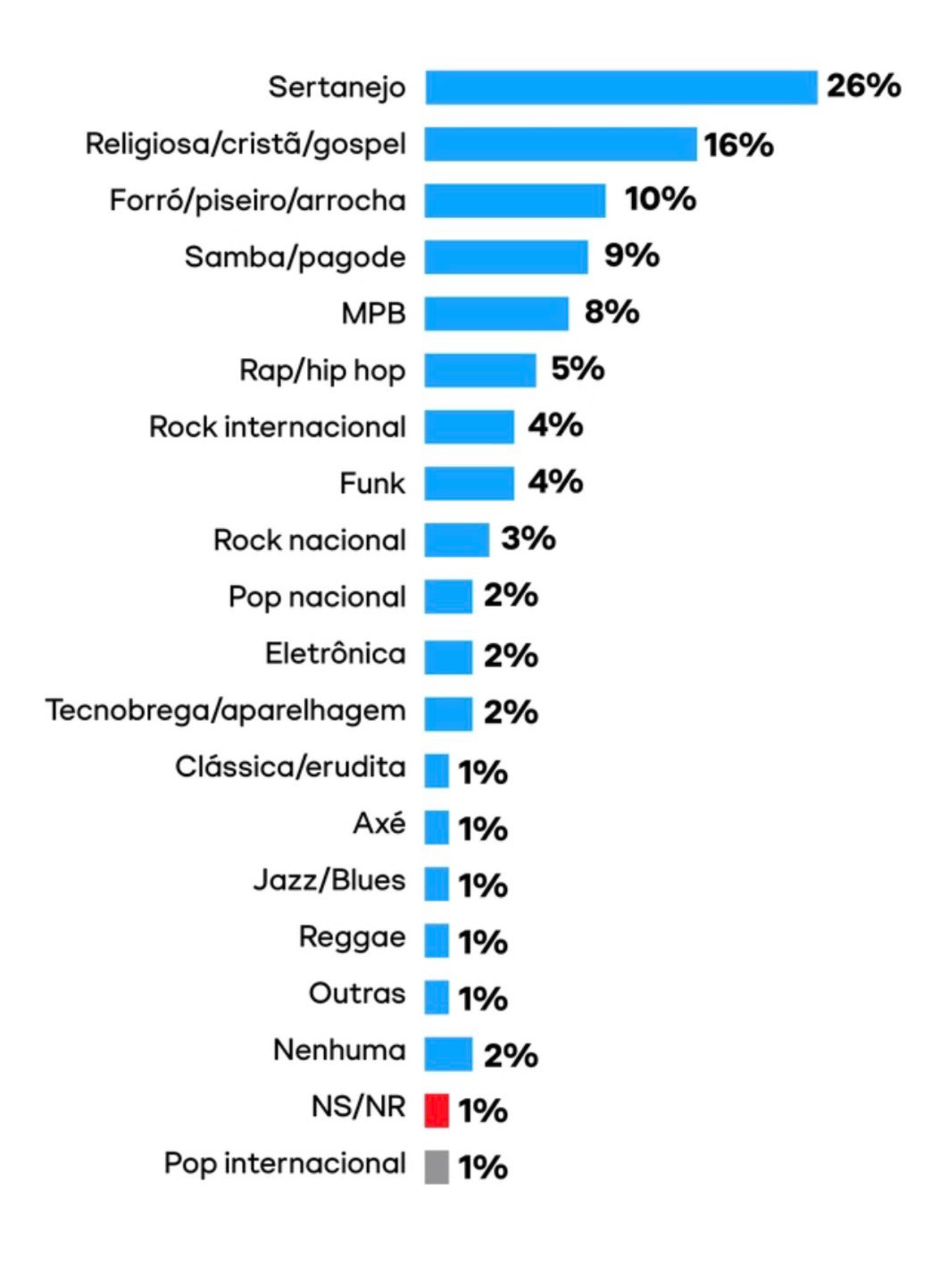 Tirando esse pequeno detalhe de misturar Forró e Piseiro com arrocha, não é surpresa ver a música sertaneja liderando, como já acontece em plataformas digitais, onde os artistas sertanejos sempre estão entre os mais escutados do país. Mas uma surpresa, podemos dizer assim, é ver gêneros como o funk, que já foram mais populares, abaixo de ritmos como rap/hip hop e rock internacional. O axé, muito associado aos anos 90, tem apenas 1% do gosto popular.