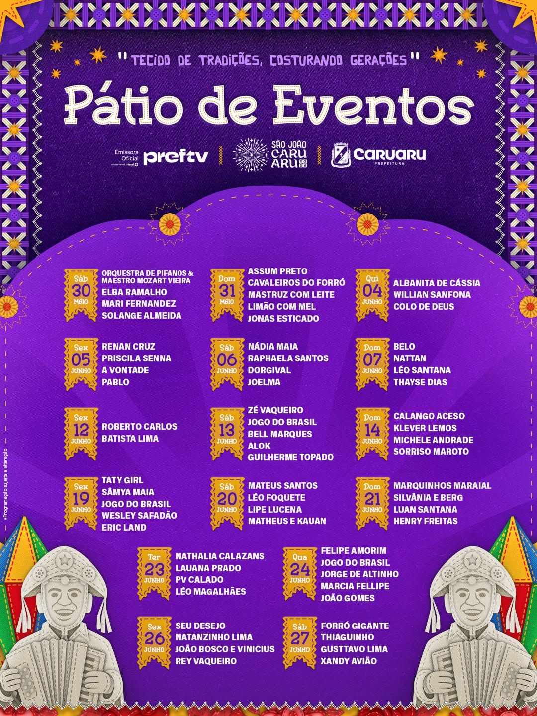 É importante lembrar que esses são apenas alguns dos polos da festa, apenas os que já foram divulgados pela Prefeitura de Caruaru. Além destes polos, a cidade ainda conta com vários outros focados em forró pé de serra, poesia, quadrilhas e muito mais.