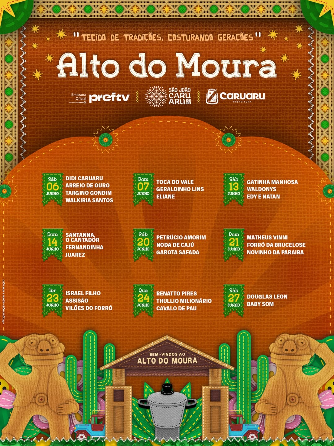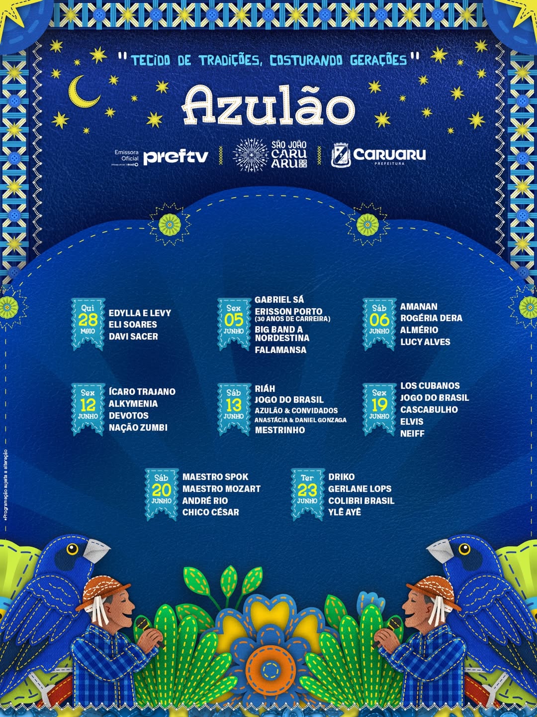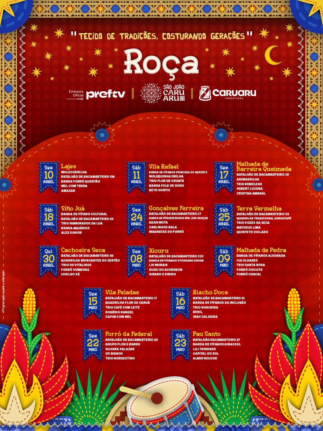 Nesta quinta-feira (19) foi divulgada oficialmente a programação completa do São João de Caruaru 2026. Ao todo serão 27 polos de muita festa em toda a cidades. Além polos como o Pátio do Forró, com grandes atrações nacionais e locais e que recebe multidões todos os dias de festa, a cidade tem polos como o tradicional Alto do Moura, com muito forró, ou o Polo Azulão, um polo mais alternativo e tantos outros.